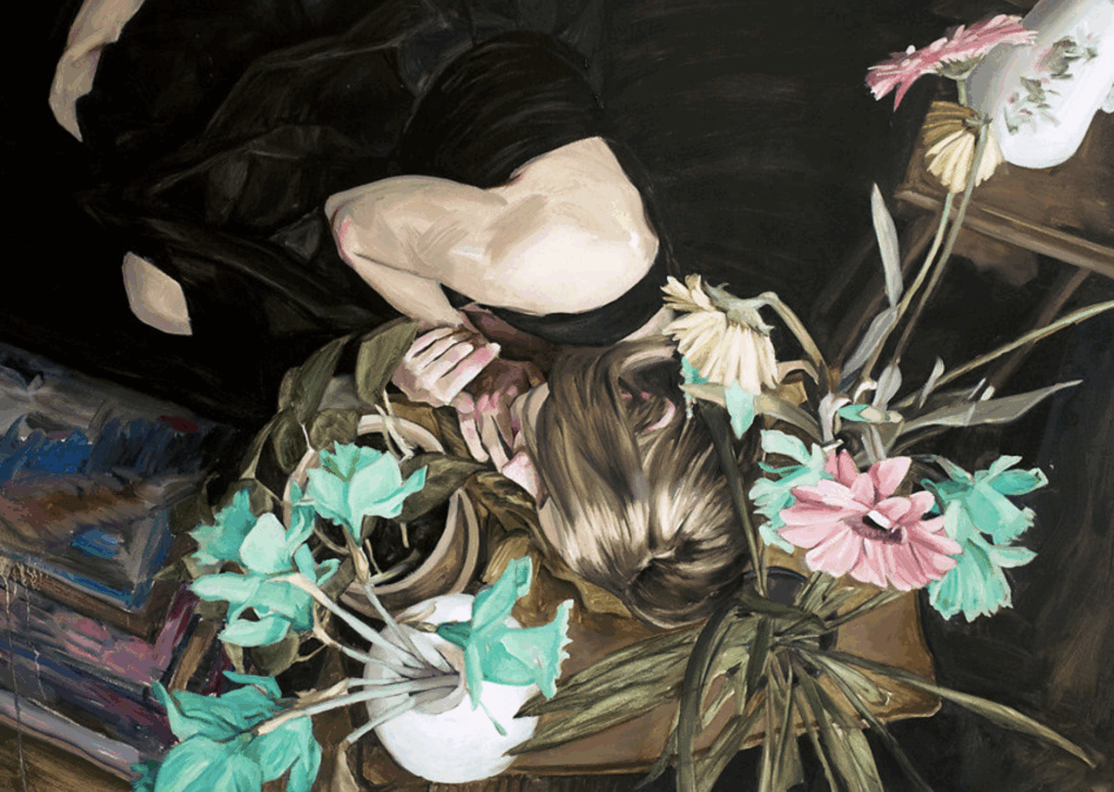 Le travail d’Hélène Delmaire traite de la fragilité, de la féminité, du rapport de l’homme à la nature et de ce qu’elle lui révèle de lui-même. Si l’humain est présent dans sa peinture, ce n’est pas de manière traditionnelle, comme sujet principal de l’image mis en valeur par son environnement. L’élément humain est au contraire la partie qui renvoie au tout. Il devient un élément parmi d’autres éléments du tableau, qu’ils soient végétaux ou issus de la nature morte.