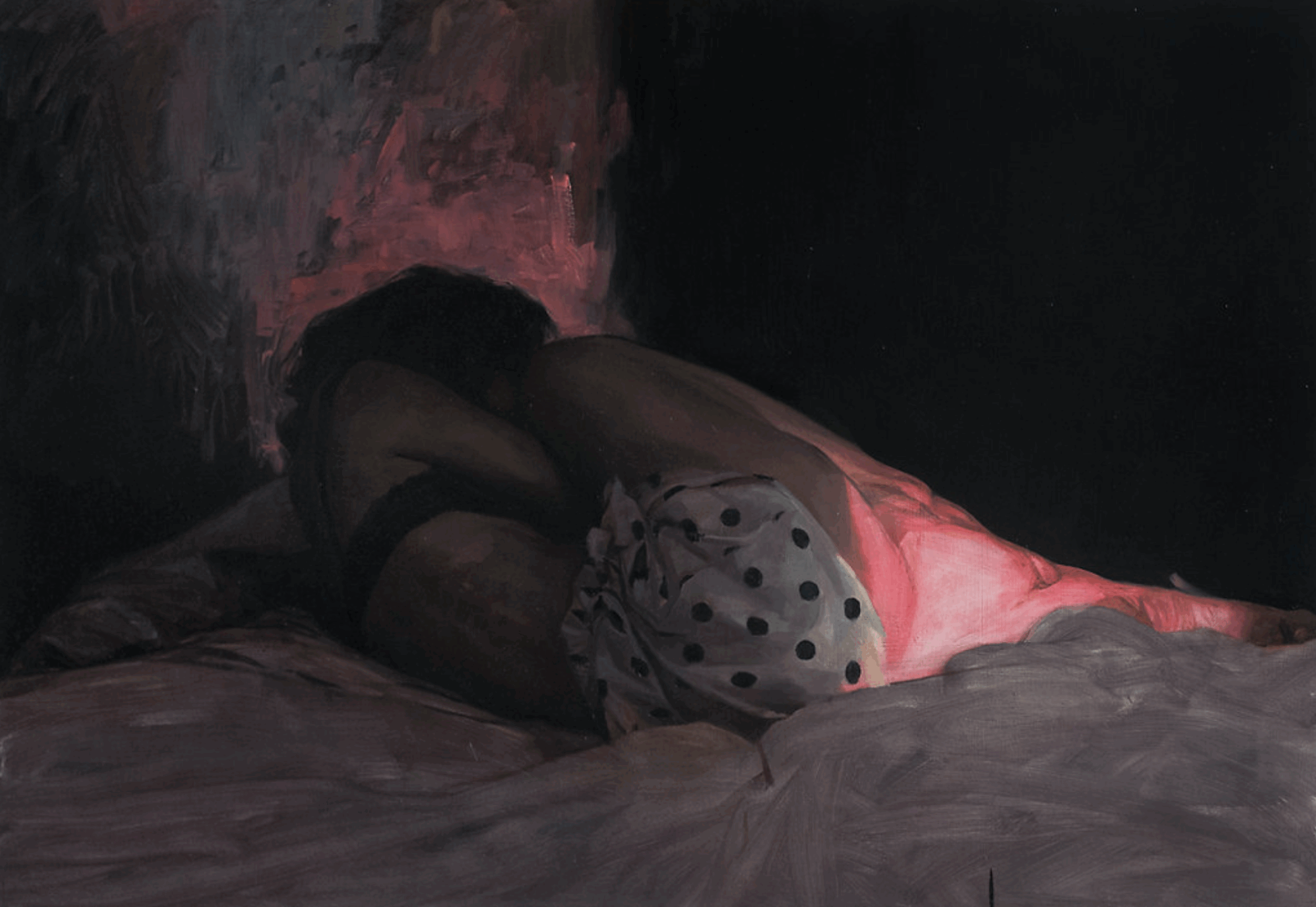 Le travail d’Hélène Delmaire traite de la fragilité, de la féminité, du rapport de l’homme à la nature et de ce qu’elle lui révèle de lui-même. Si l’humain est présent dans sa peinture, ce n’est pas de manière traditionnelle, comme sujet principal de l’image mis en valeur par son environnement. L’élément humain est au contraire la partie qui renvoie au tout. Il devient un élément parmi d’autres éléments du tableau, qu’ils soient végétaux ou issus de la nature morte.