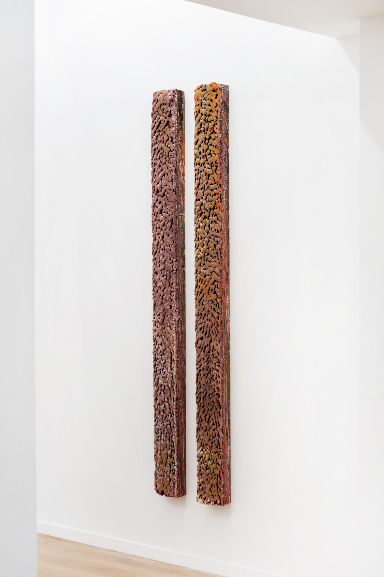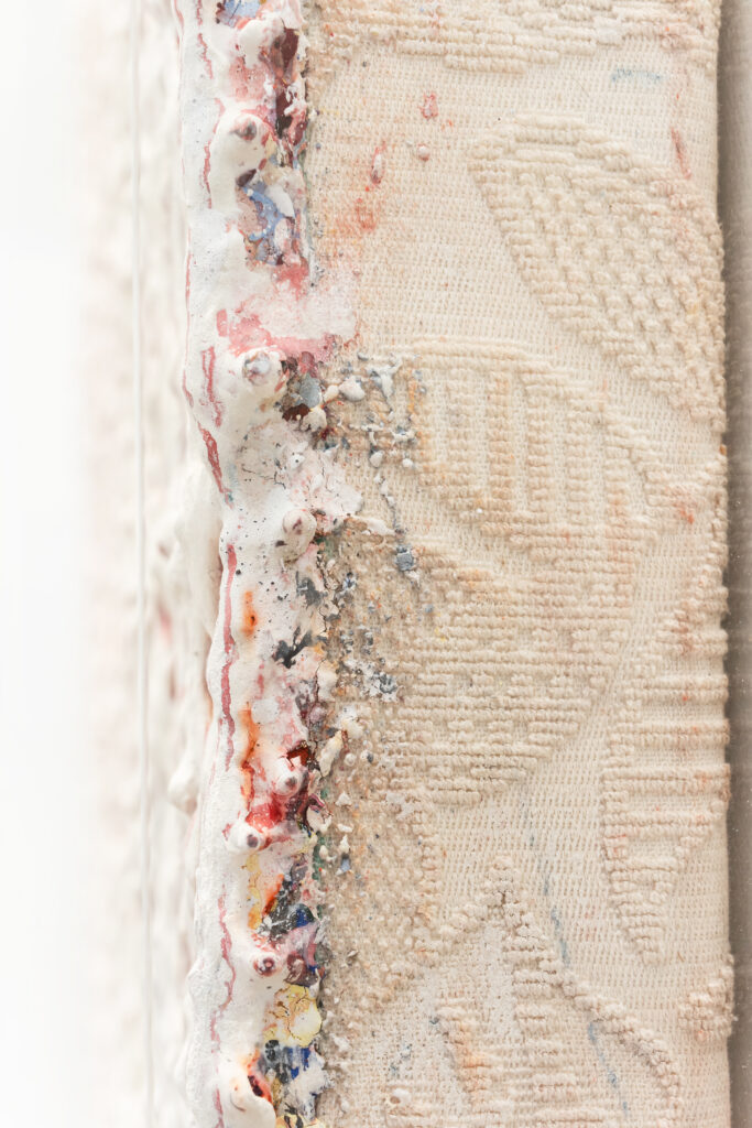 Celui qui regarde ces tableaux est alors frappé par la différence entre la matière obtenue, solide et structurée, et le geste presque chorégraphique qui l’a engen- drée. Une sorte de caresse. Frappé aussi par l’orfèvrerie de l’ouvrage, la délicatesse de certaines zones colorées. Et le regard scrute cette surface de paradoxe, qui nous fascine par son unité mais aussi par les traces de tous les possibles, sous la dernière couche, le dernier geste.