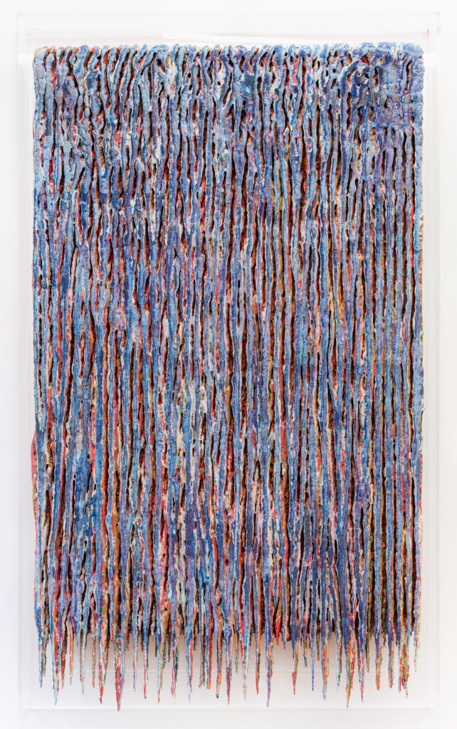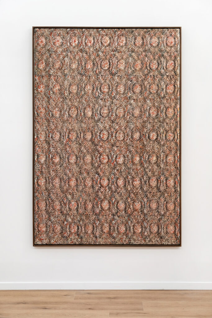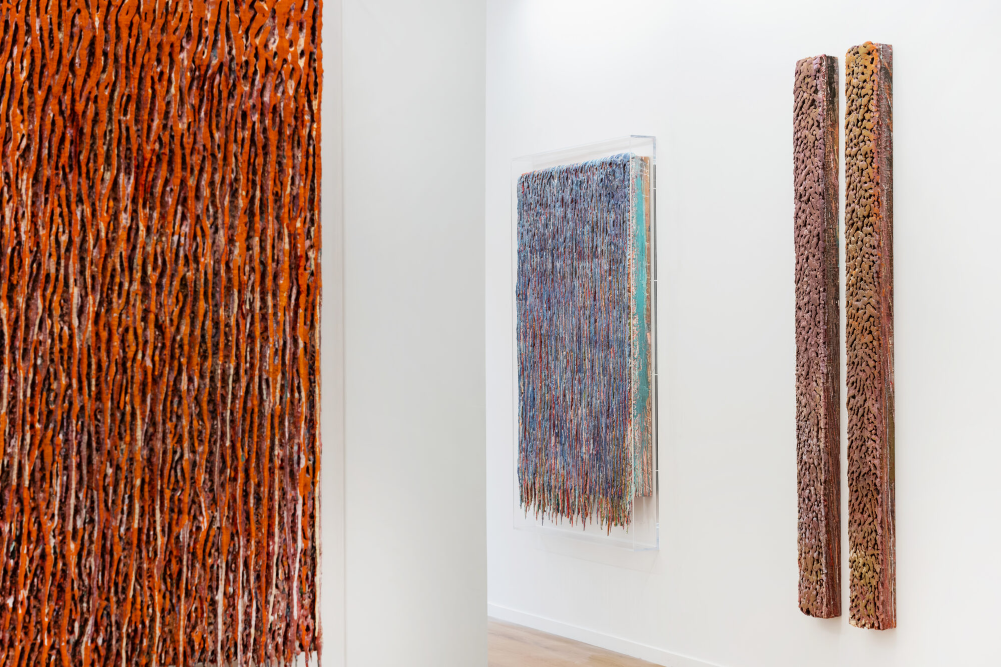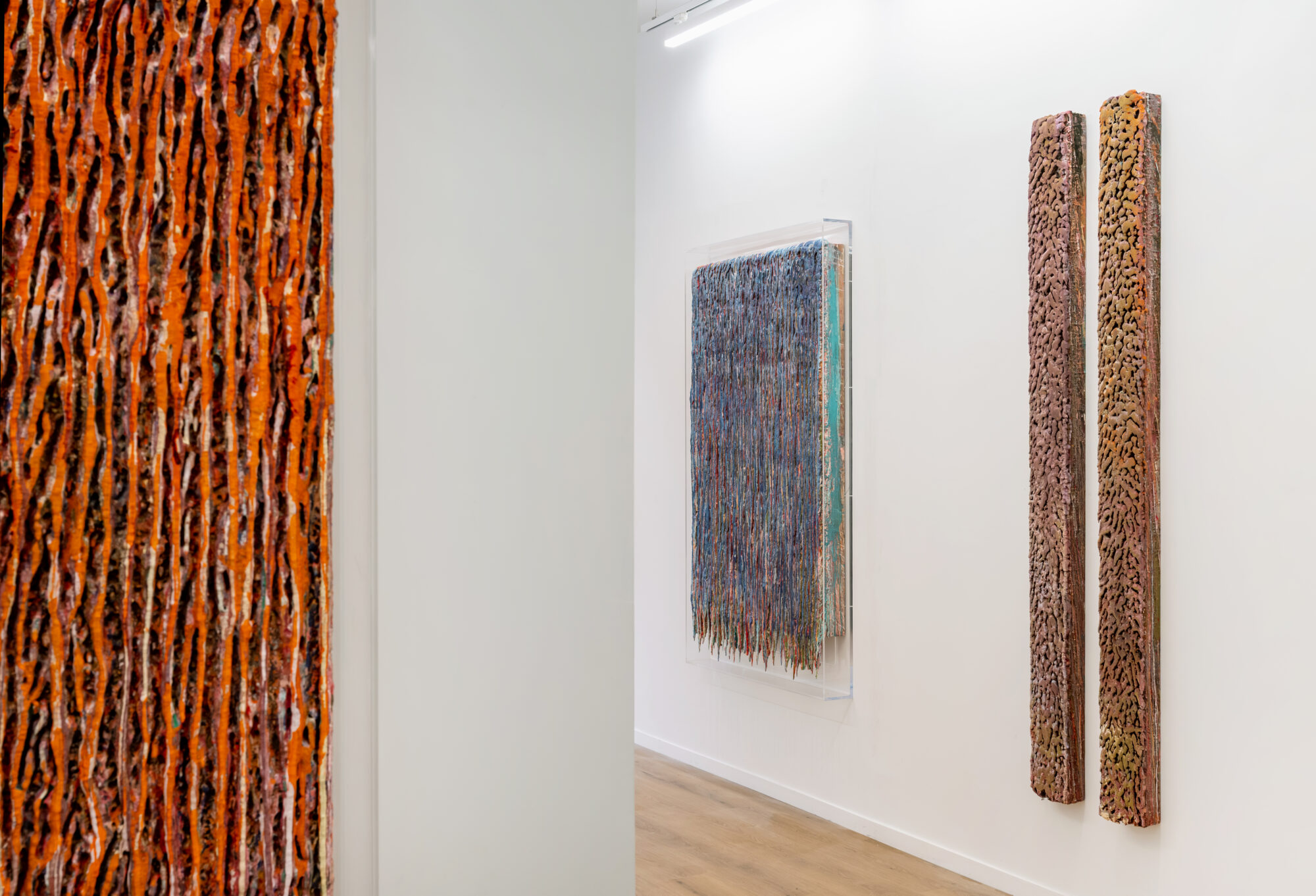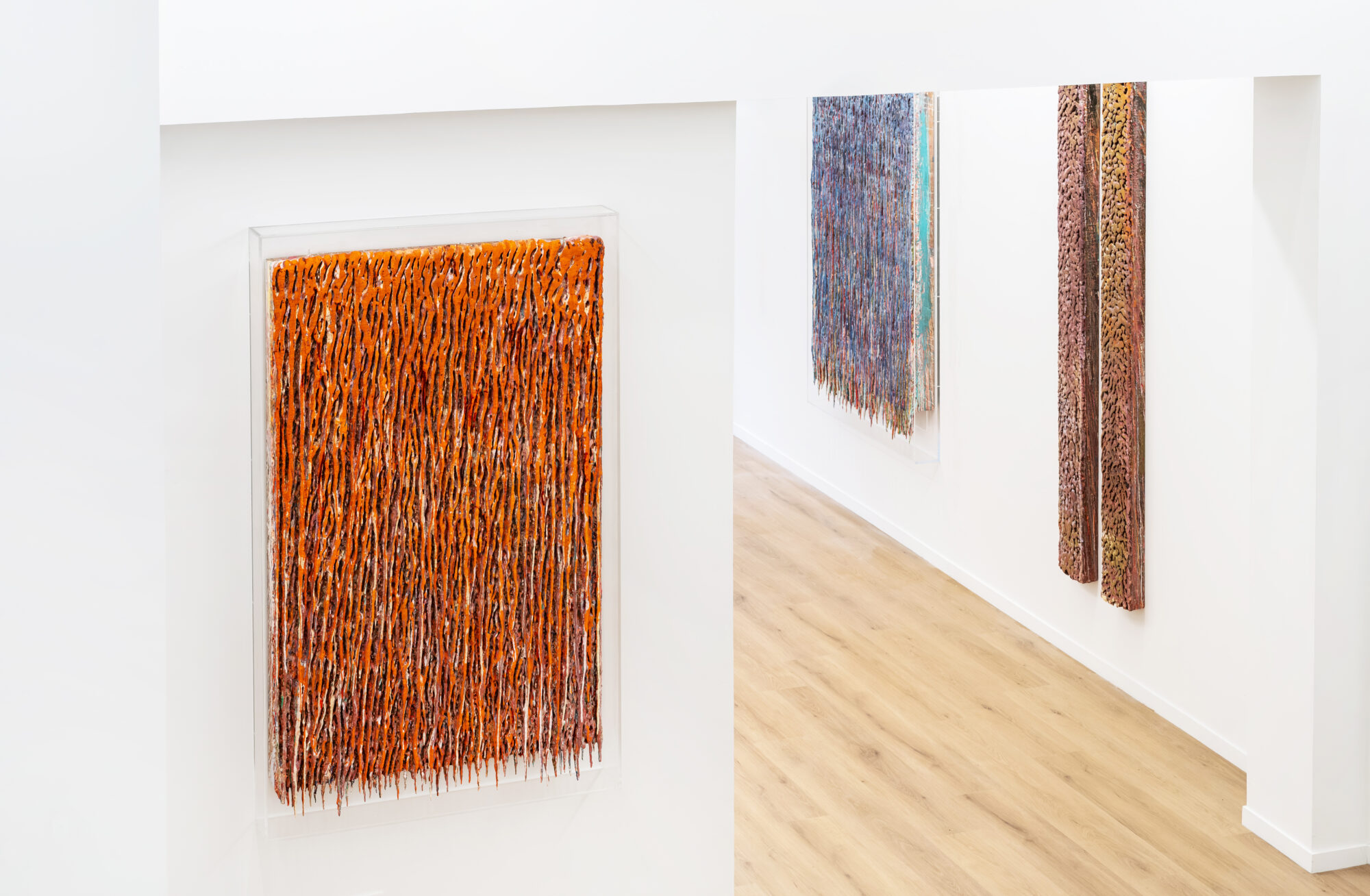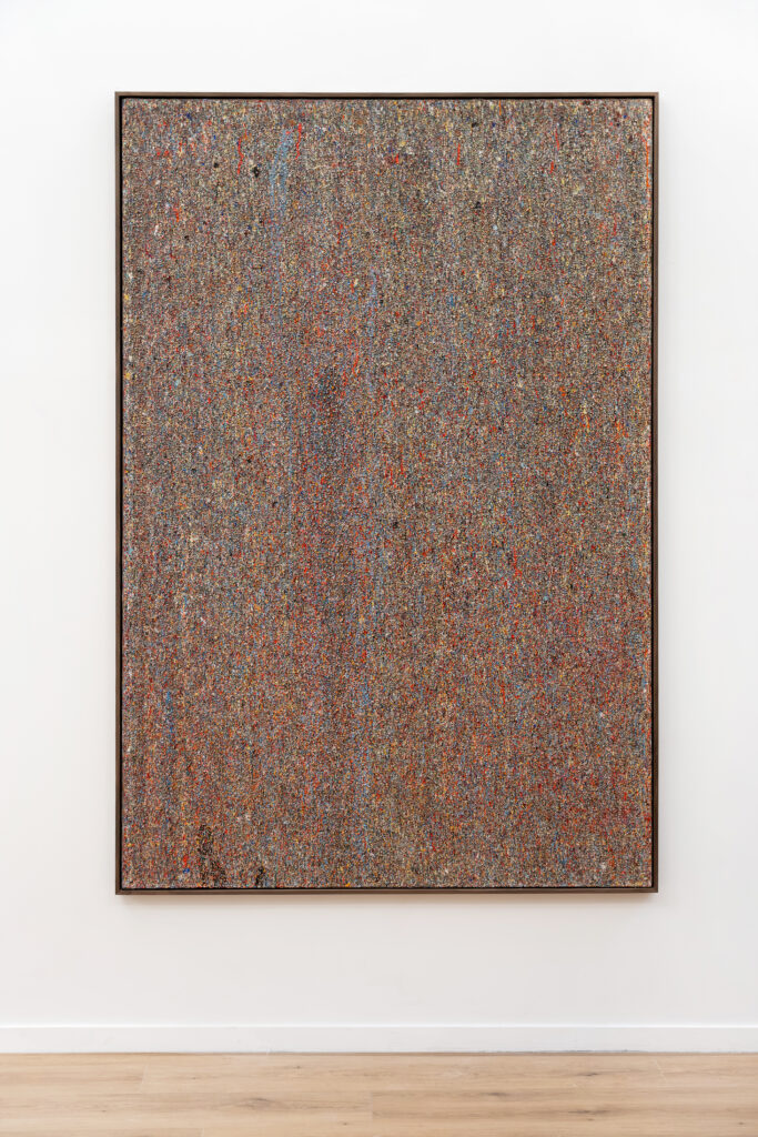 Dans ces verticales qui s’étirent, dans ces veines de couleur qui se mêlent, se lit une histoire qui se reforme à chaque instant, dont les cicatrices ne disparaissent jamais tout à fait, mais se transforment en fondation. Chaque toile devient une archive du passage, une matrice où le visible et le recouvert coexistent dans un même souffle.
