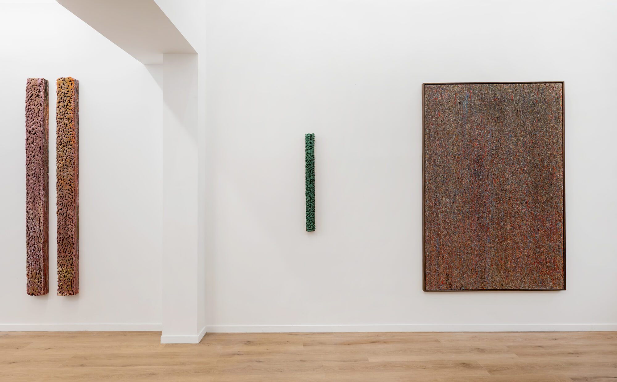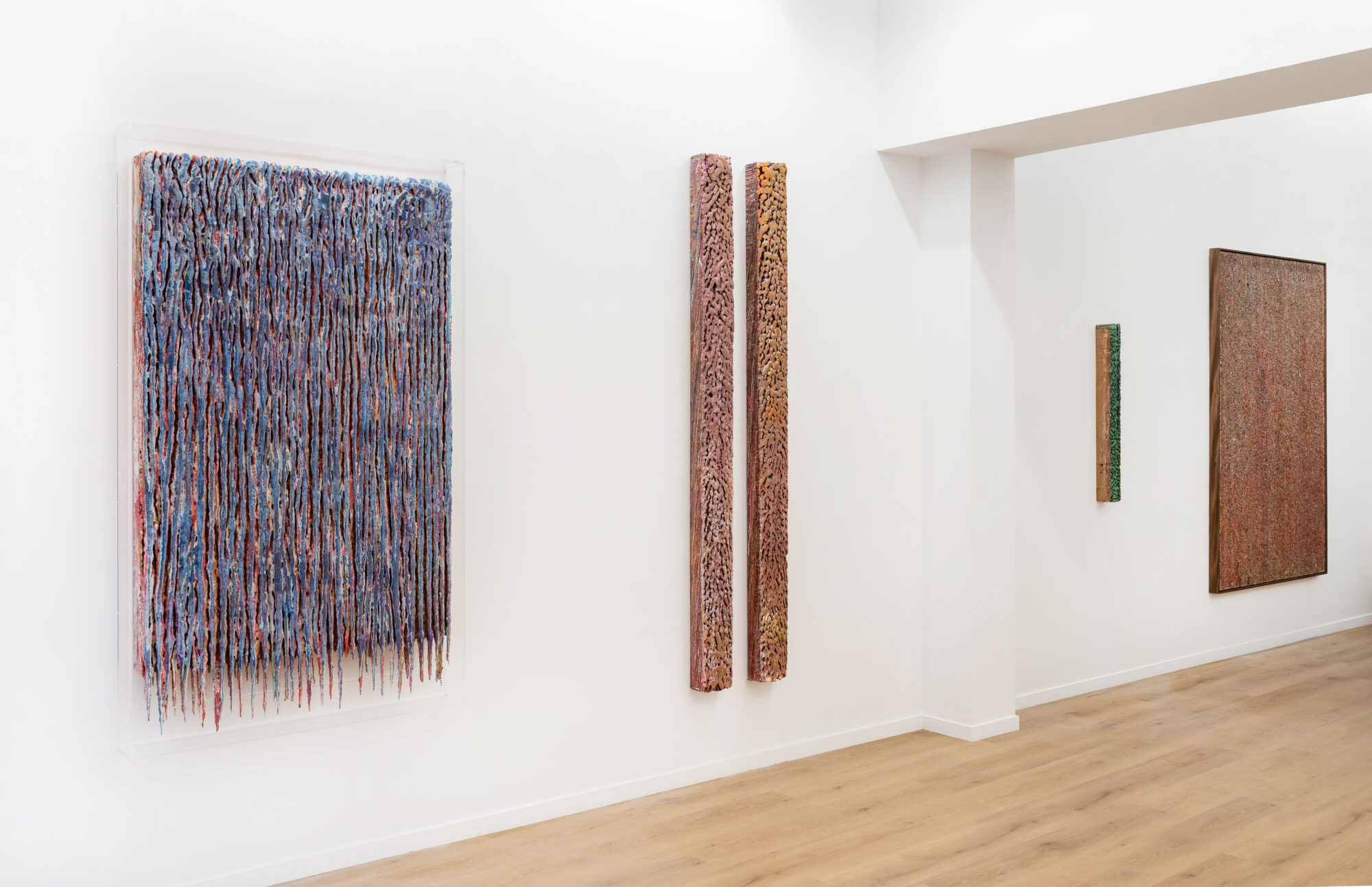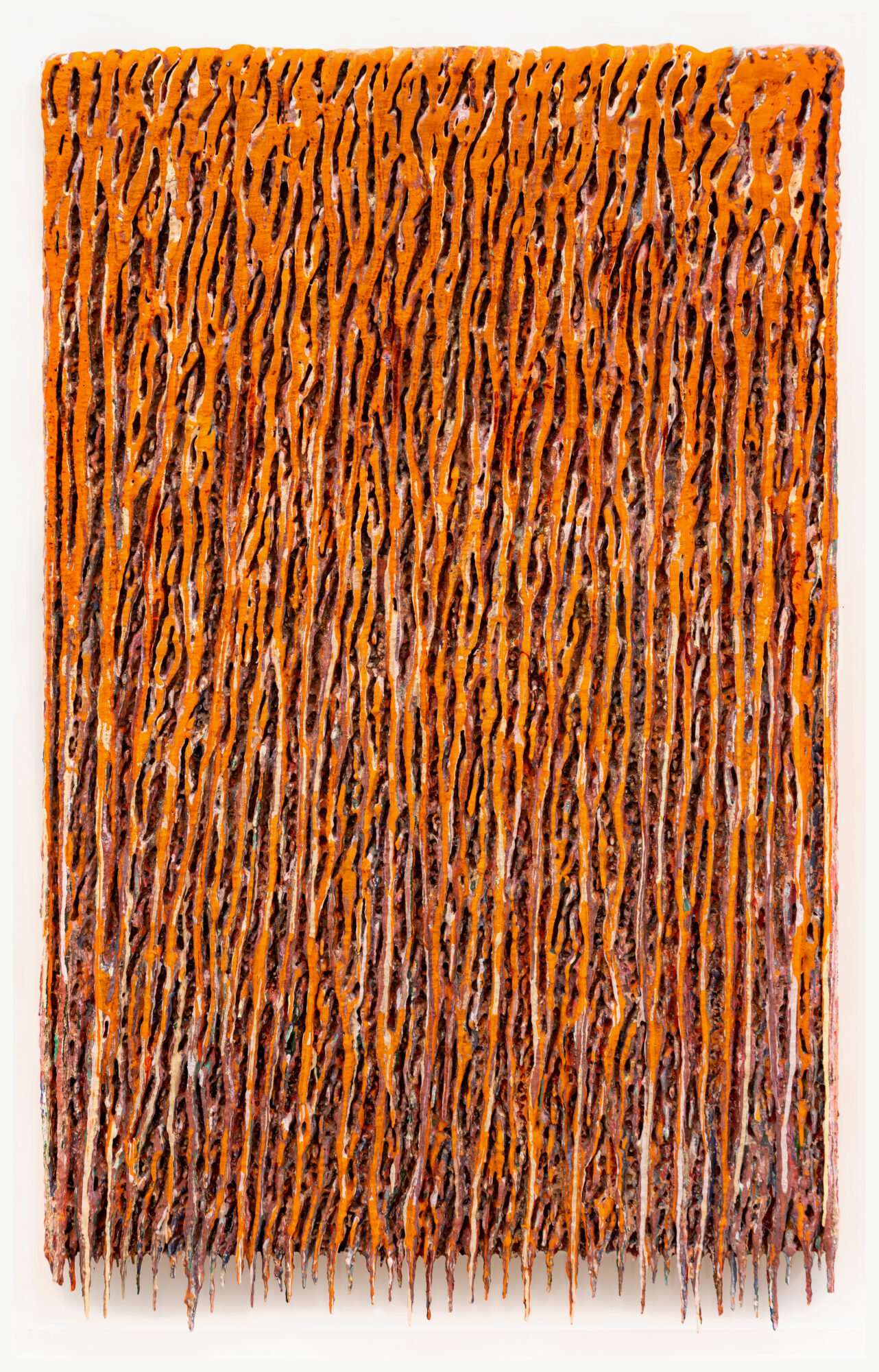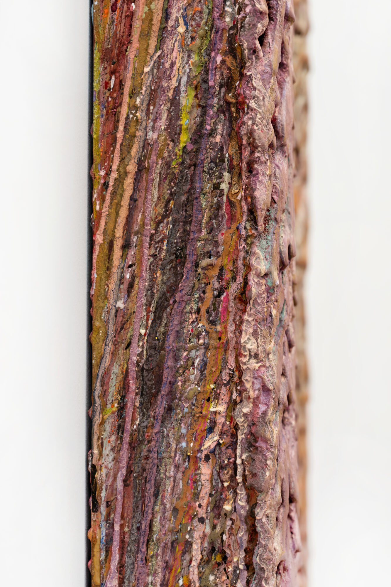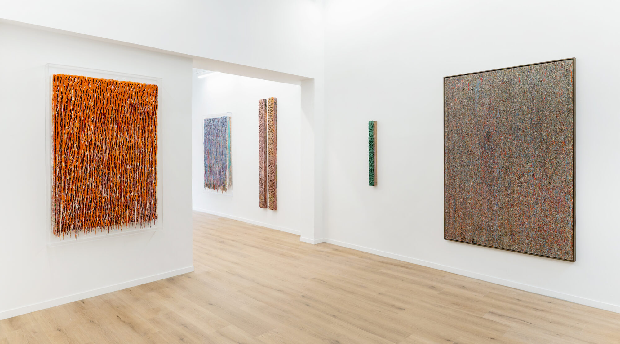 Dans ces verticales qui s’étirent, dans ces veines de couleur qui se mêlent, se lit une histoire qui se reforme à chaque instant, dont les cicatrices ne disparaissent jamais tout à fait, mais se transforment en fondation. Chaque toile devient une archive du passage, une matrice où le visible et le recouvert coexistent dans un même souffle.